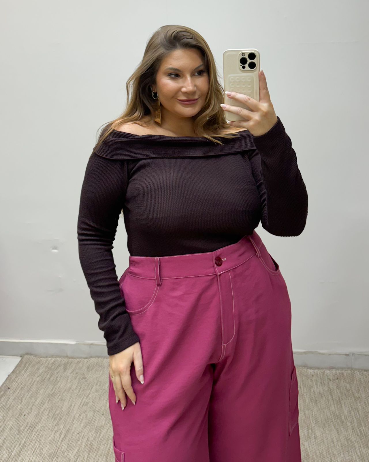 Blusa de manga longa na malha exclusiva da Kayla, com charme de ombro a ombro. Tecido leve e fresco.