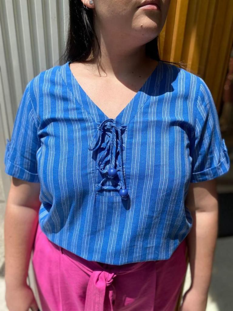 BLUSA SOCIAL, COM AMARRAÇÃO NO BUSTO E LISTRAS VERTICAIS NA COR AZUL