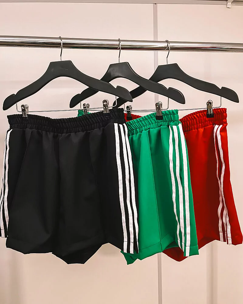 Shorts track em poliéster com pregas frontais e bolsos laterais, possui elástico em todo a circunferência da cintura.
